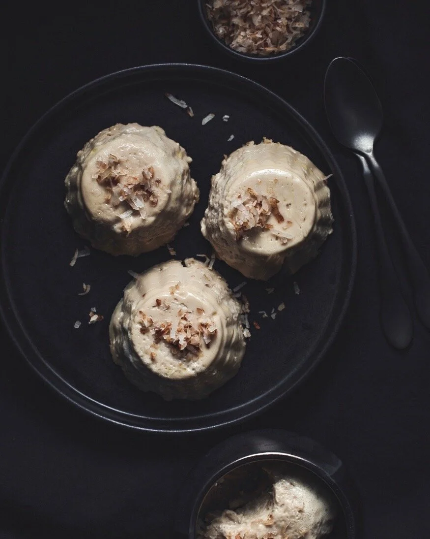 This easy, luscious pudding comes together in minutes. Rich, creamy and not cloyingly sweet, it is perfect any time of day or year. I opted to serve it garnished with toasted coconut, but it would also pair well with fresh fruit like mango, lychee, passion fruit or pomegranate. To make a vegan version, simply substitute the milk and cream with canned coconut milk.